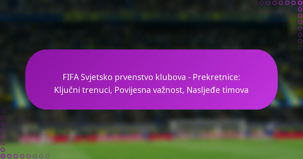 FIFA Svjetsko klupsko prvenstvo svjedočilo je brojnim ključnim trenucima koji su oblikovali njegovo nasljeđe i značaj u međunarodnom nogometu. Od ikoničnih finala do nezaboravnih iznenađenja, ovi prekretnici ističu utjecaj turnira na timove i igrače.